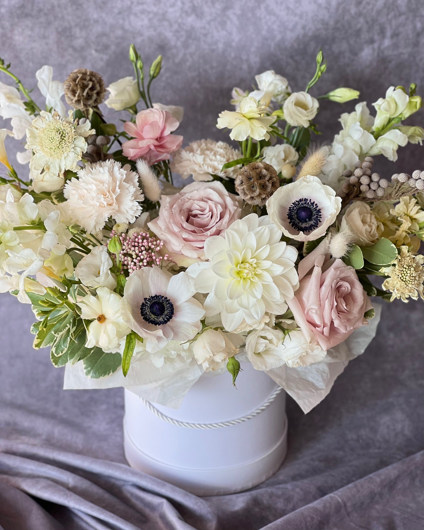 An arrangement of seasonal blooms in off-white, beige, green color scheme.